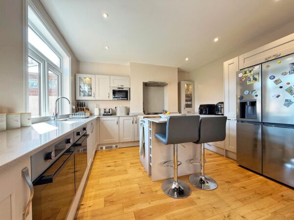 * Open plan kitchen/dining room with flooring to match hall in kitchen area, along with a stylish range of re fitted units with integrated appliances, island unit with breakfast bar and quartz work surfaces.