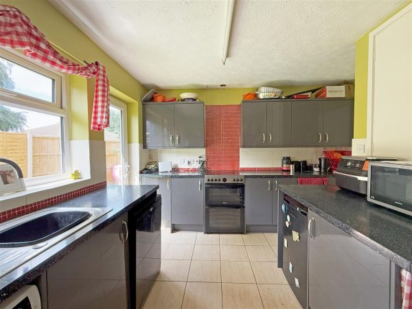 * Modern fitted kitchen with integrated appliances and glazed door onto the rear garden