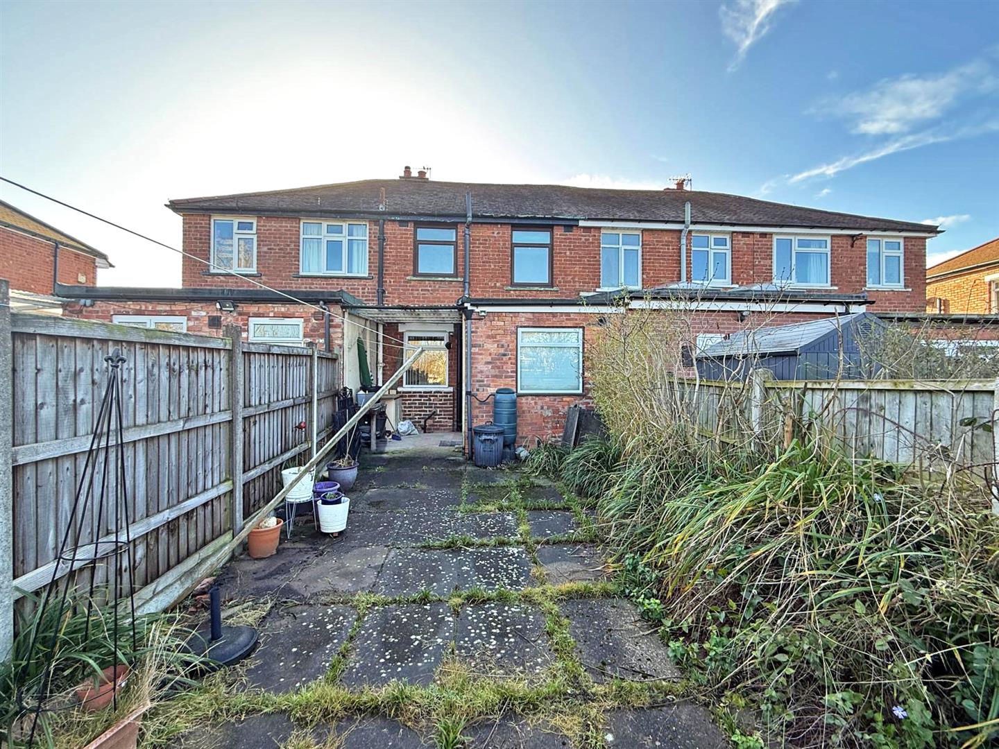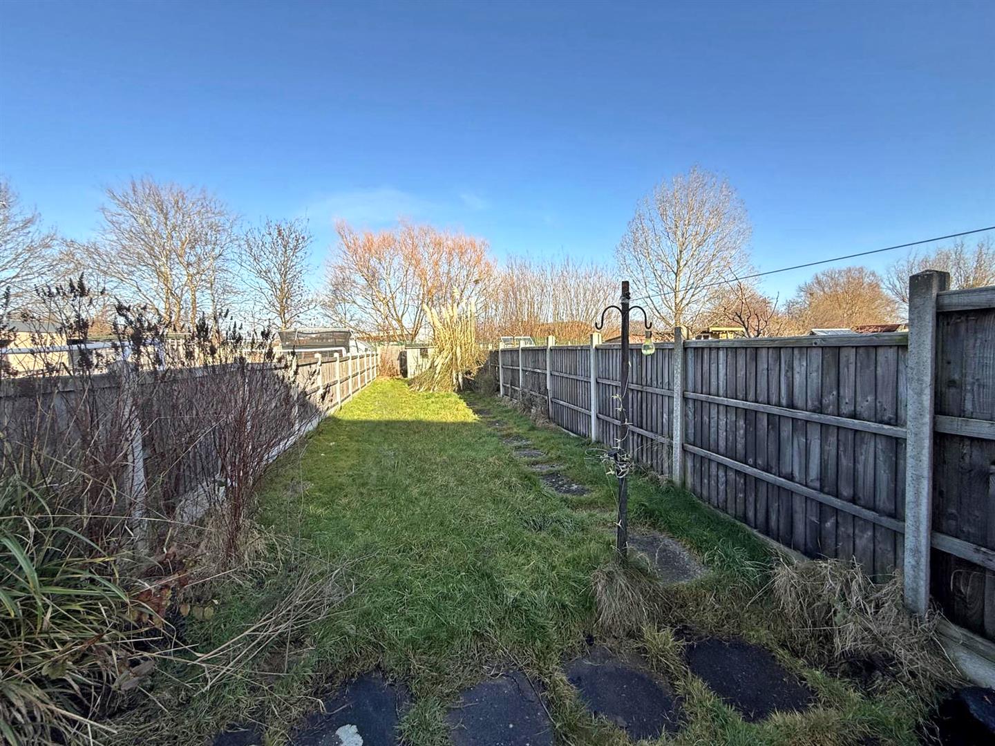 * Large private rear garden, laid to lawn with paved terrace, covered storage area, and planted borders
