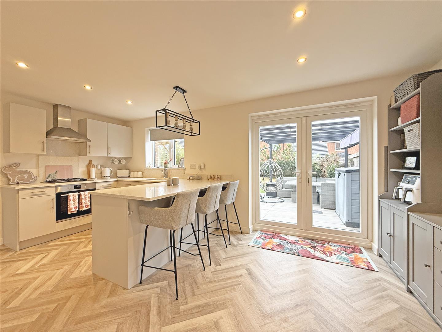 * Impressive open plan kitchen/dining room, complete with integrated appliances, quartz work surfaces, useful pantry, and glazed doors to rear