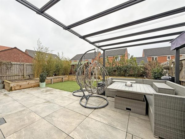 * Stunning recently landscaped private garden, laid to artificial lawn with a large paved sun terrace and pergola, as well as planted borders, established trees for screening, and a useful garden store