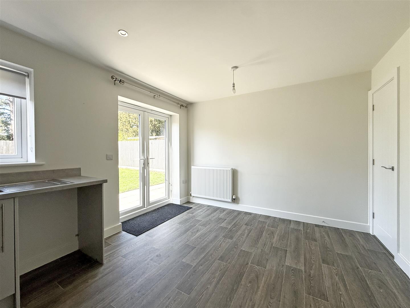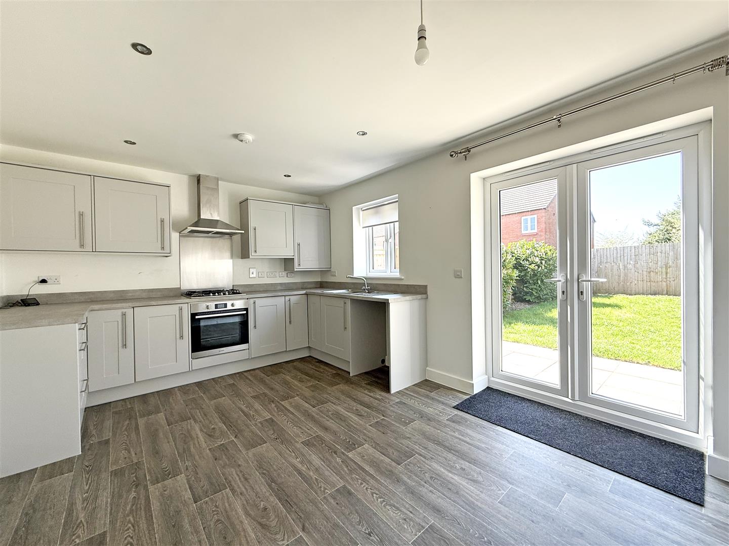 * Open plan kitchen/dining room, complete with a range of well-fitted units, space for appliances, useful under stairs storage, and glazed double doors onto the garden