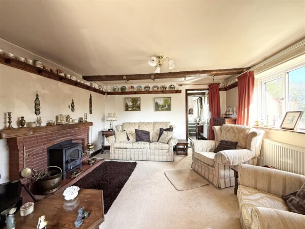 * Entrance porch opening to a good-sized living room with feature fireplace and wood burning stove