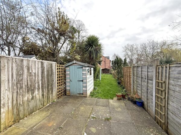 * Private rear garden, laid to lawn with a paved sun terrace, timber garden store and summerhouse