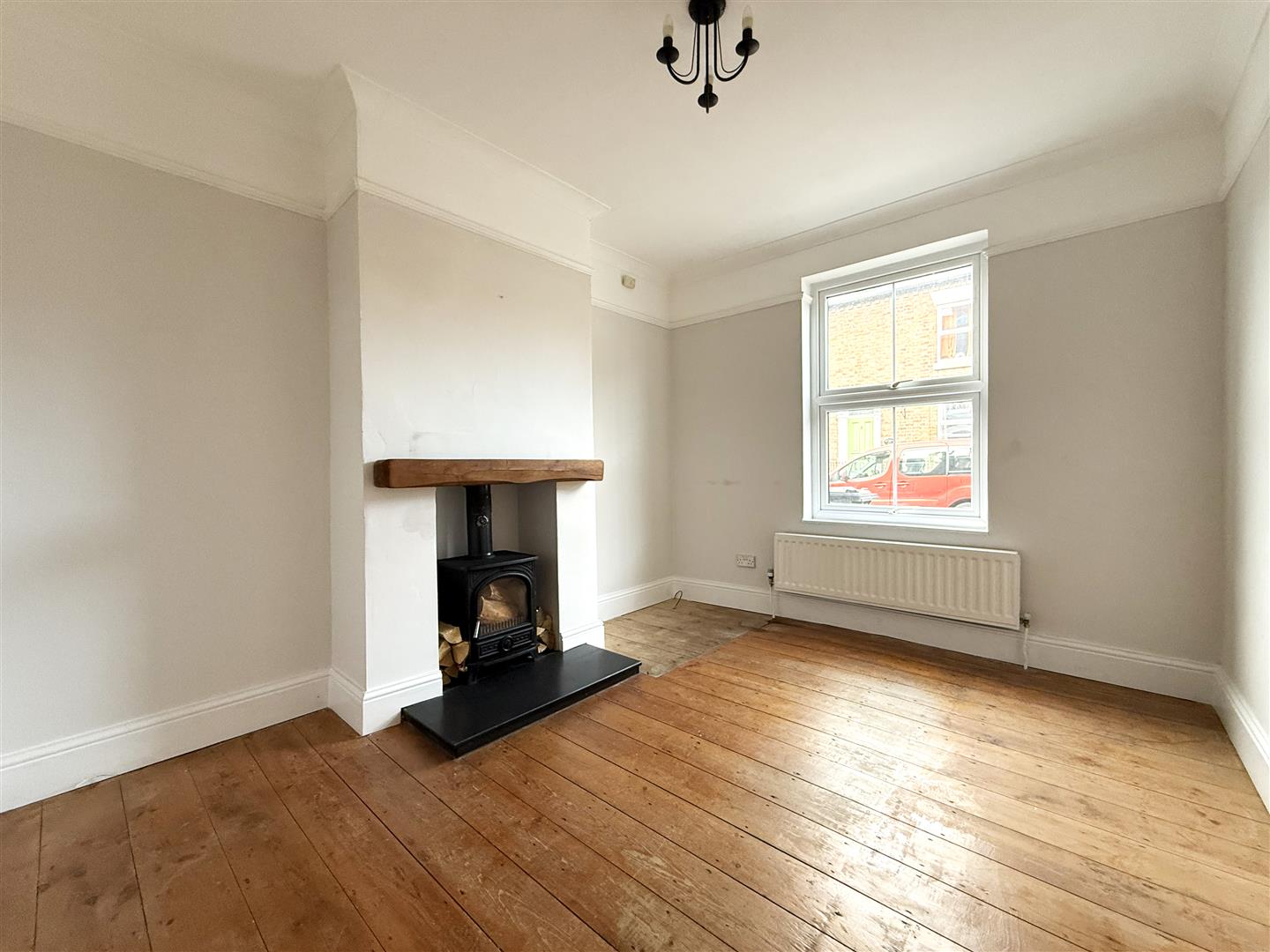 * Living room with feature fireplace, wood burning stove, and window to front