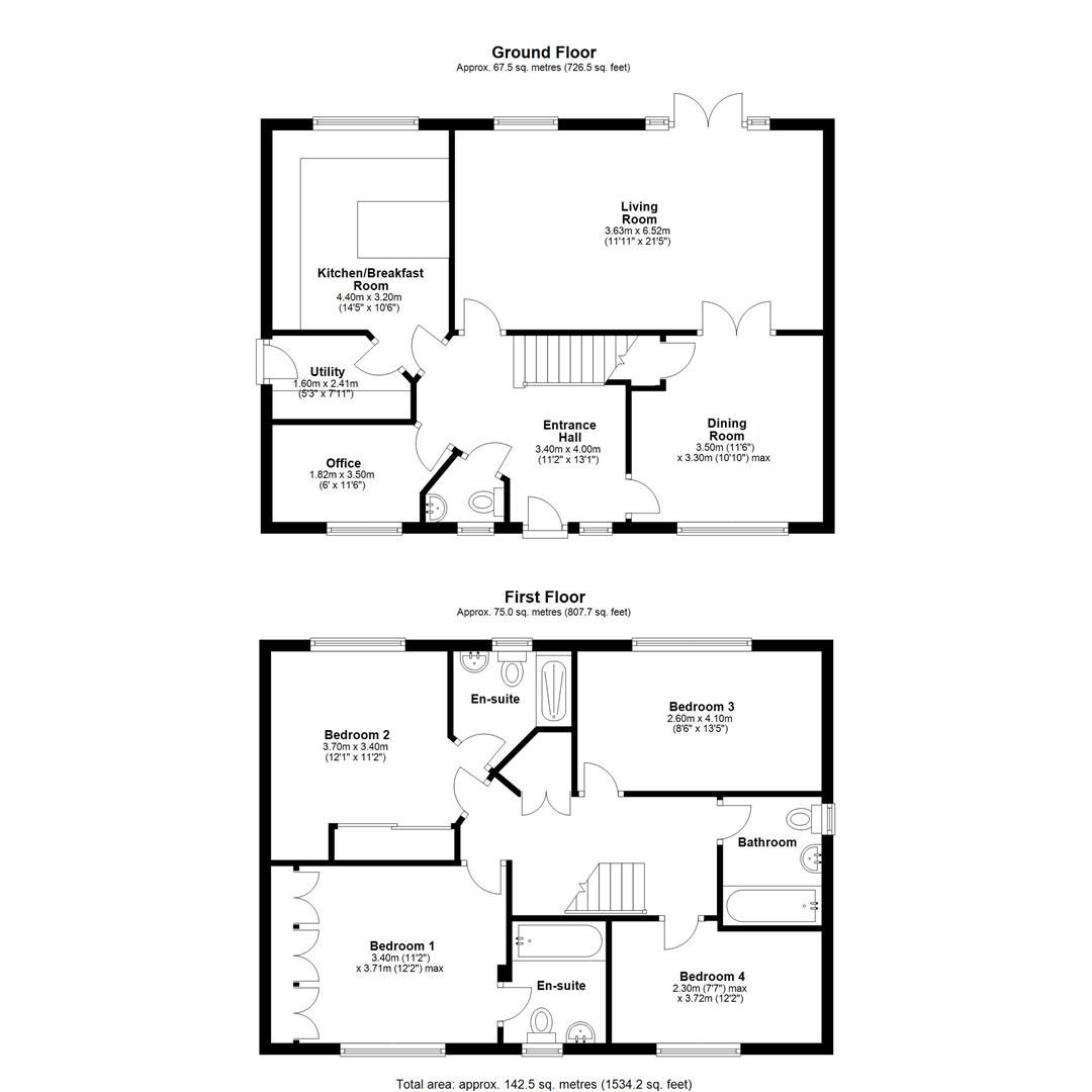 * Staircase from hall to landing where there are 4 bedrooms and a family bathroom. Two of the bedrooms also have built in wardrobes and en suite shower or bathrooms.
