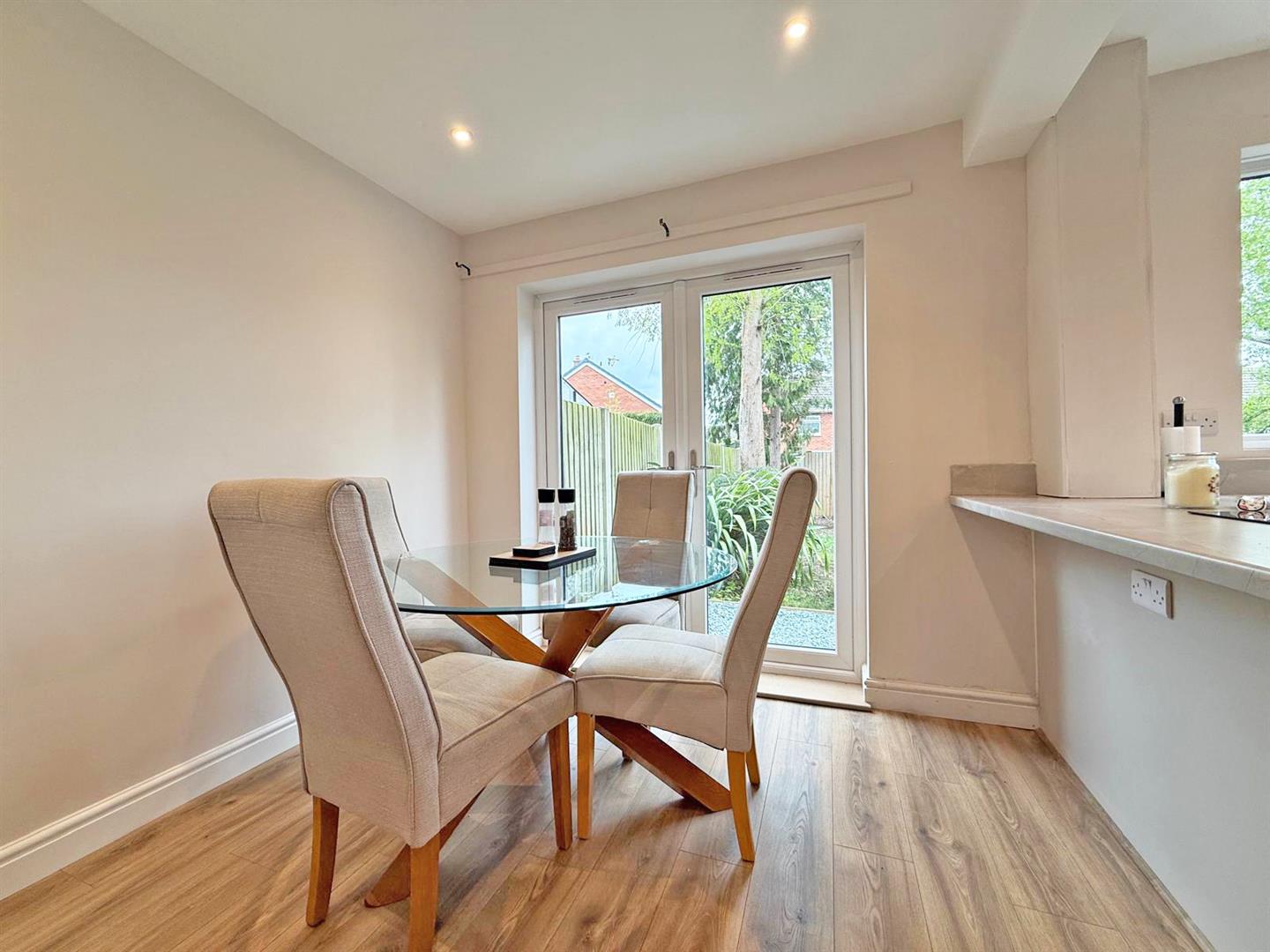 * Newly fitted open plan kitchen/dining room which has wood effect flooring, window and glazed double doors to rear, as well as a further door to side