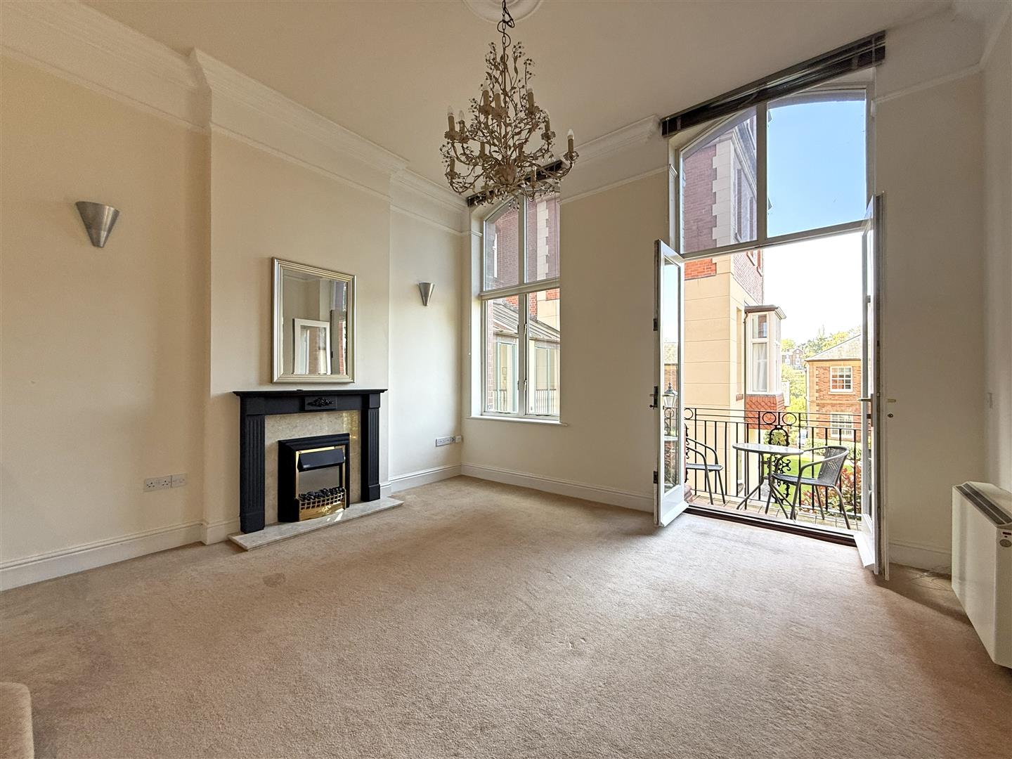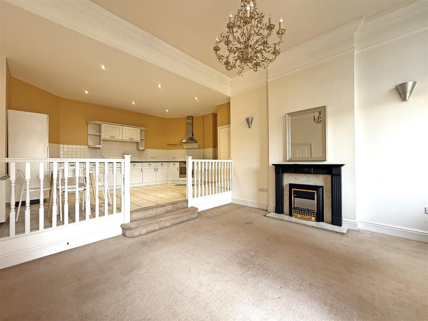 * Lovely open plan kitchen/living/dining room with feature fireplace and glazed double doors onto the balcony