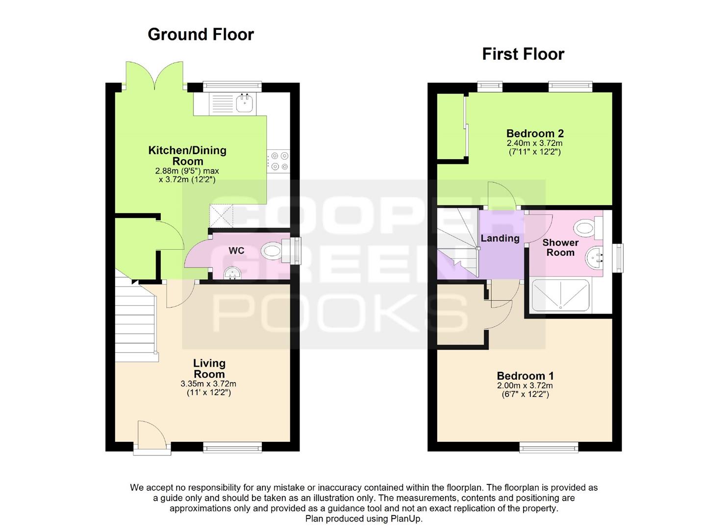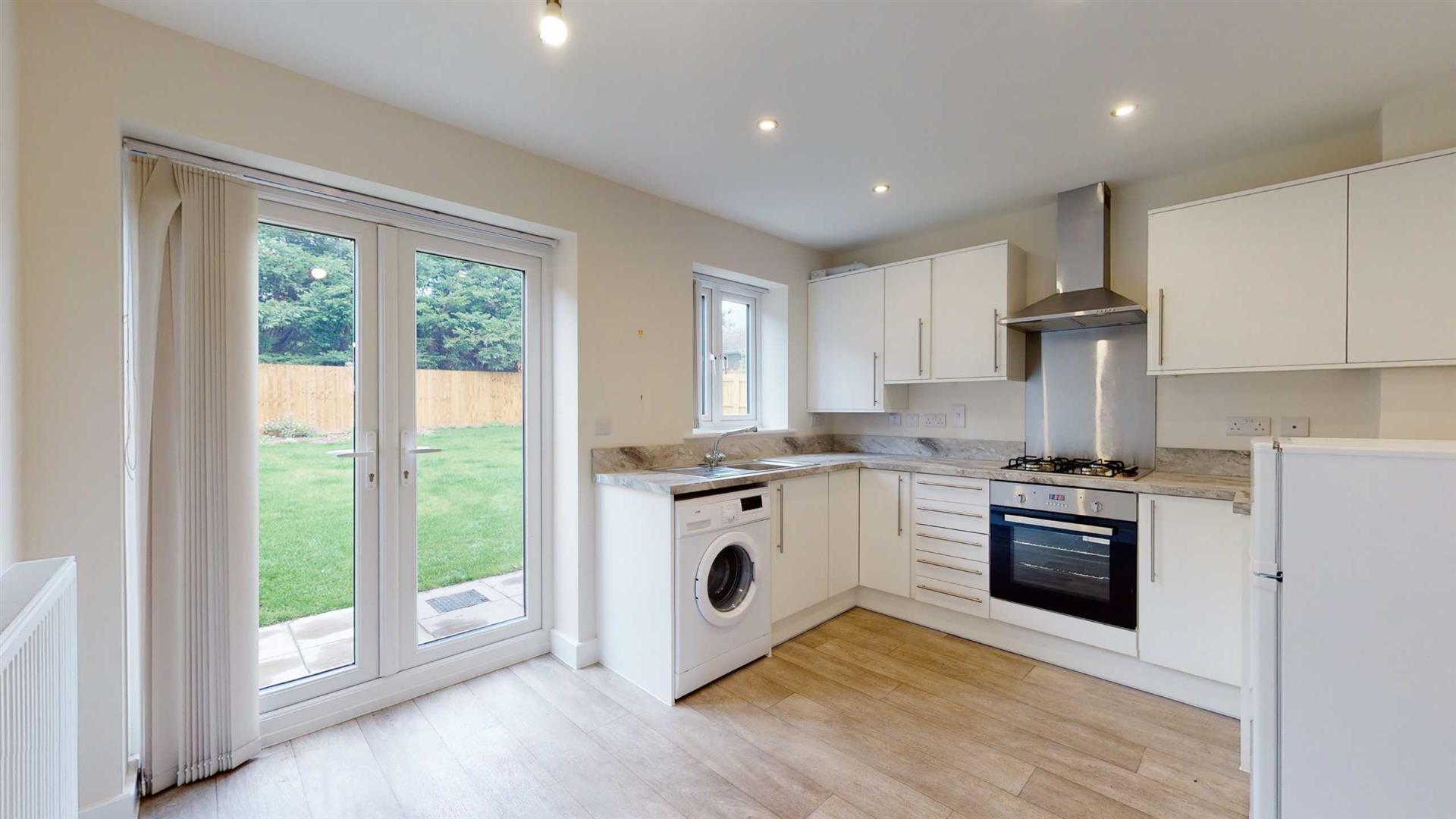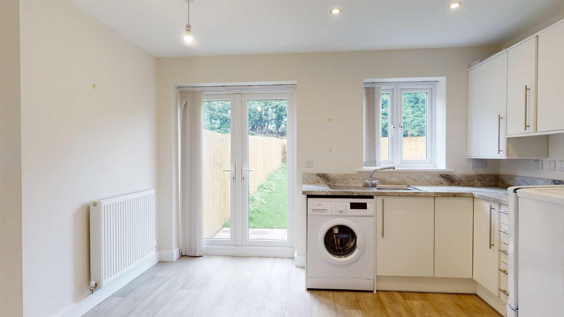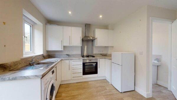 Comprising: Entrance hall, WC, kitchen with integrated oven and gas hob, space for a freestanding washer/dryer and full height fridge/freezer, living room. Stairs to first floor landing, two double bedrooms, shower room. Gas central heating. Double glazing. Driveway parking. Front and rear gardens. EPC B.