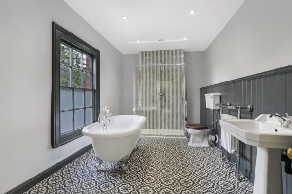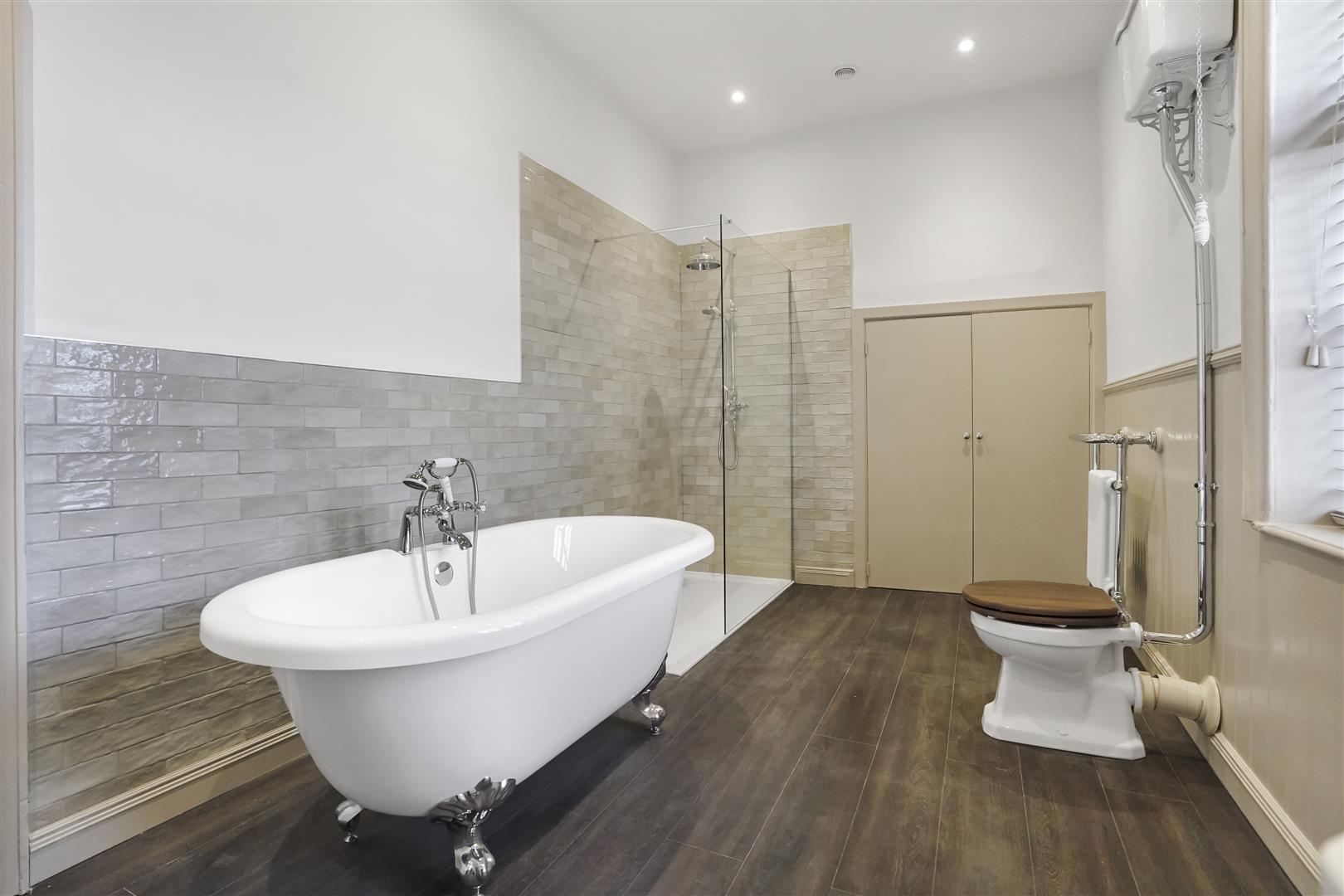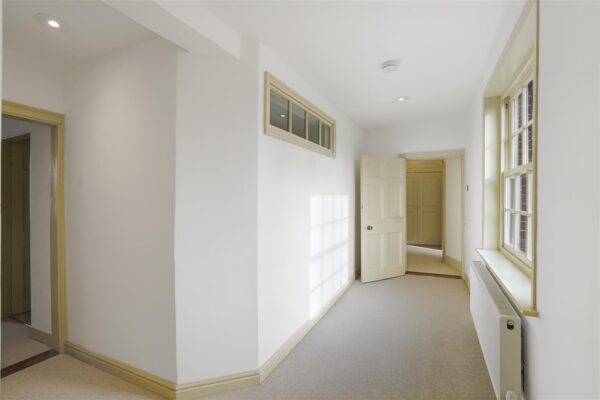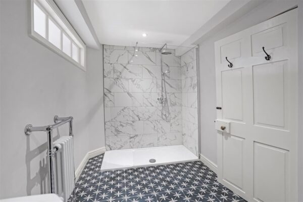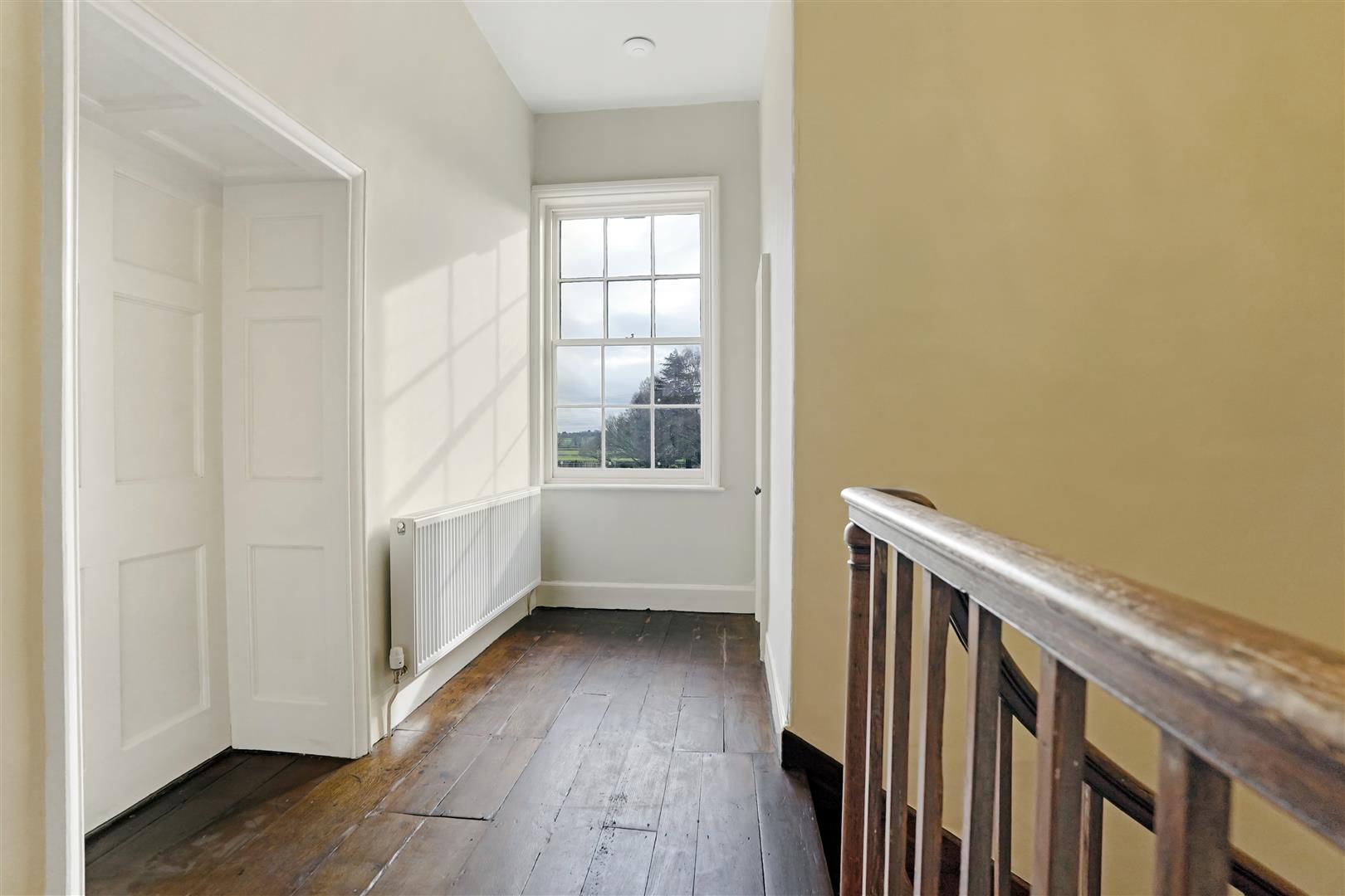 Main stairs to first floor landing, Bedroom One with double height ceilings and three tall sash windows overlooking the front, side and rear of the property, Bathroom with roll top bath, walk in shower and under floor heating, storage cupboard, part way down the stairs is a second landing with a wide built in linen cupboard, Bedroom Four with built in wardrobe, Bathroom with roll top bath, walk-in shower and under floor heating, Bedroom Two with original beams, Bedroom Three with En-Suite Shower Room featuring a walk-in shower, Stairs down to rear porch and Stairs to Second Floor Landing. Second Floor Landing, Three further double bedrooms with built in storage, Shower Room with under floor heating.