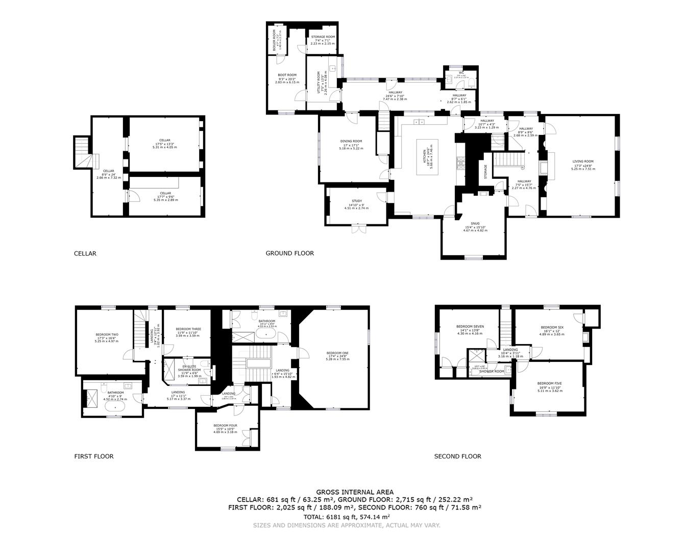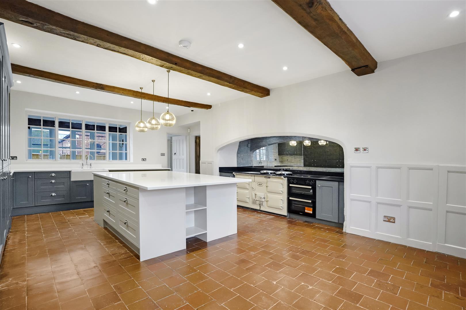 Comprising: Entrance hall with original Milton tiles and staircase, Living Room with double height ceilings, open fireplace and three floor to ceiling sash windows overlooking the front and side of the property, stairs down the Cellar with two vaulted dry rooms, Kitchen with oil fired Aga and original quarry tile flooring, additional double electric oven and electric hob, new fitted kitchen units to include integrated fridge and freezer, dishwasher, wine fridge and double Belfast sink, rear Porch with double glazed windows, WC, stairs leading to first floor landing, Utility with fitted cupboards, ceramic sink and under counter space for a washing machine and dryer, Boot Room with Boiler Room and additional storage. Off the Porch is the Dining Room with original quarry tile flooring and under stairs storage and door to the Kitchen, Study with fitted bookshelves and original French doors to patio, Snug with sash window overlooking front gardens, under stairs storage, new log burner and connecting door to the Entrance Hall.