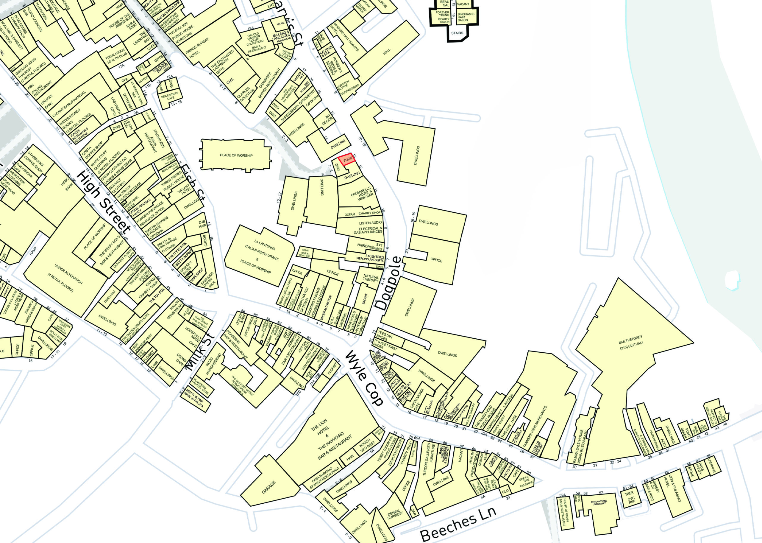 The shop is located at the top of Dogpole and occupies a prominent corner position where St Mary’s Street meets Dogpole. Dogpole and St. Mary’s Street form part of the one-way traffic loop around the town and leads to Wyle Cop. The nearest parking is at NPC Wyle Cop and there are numerous bus routes along St. Mary’s Street.